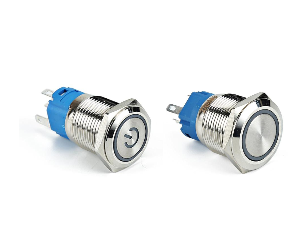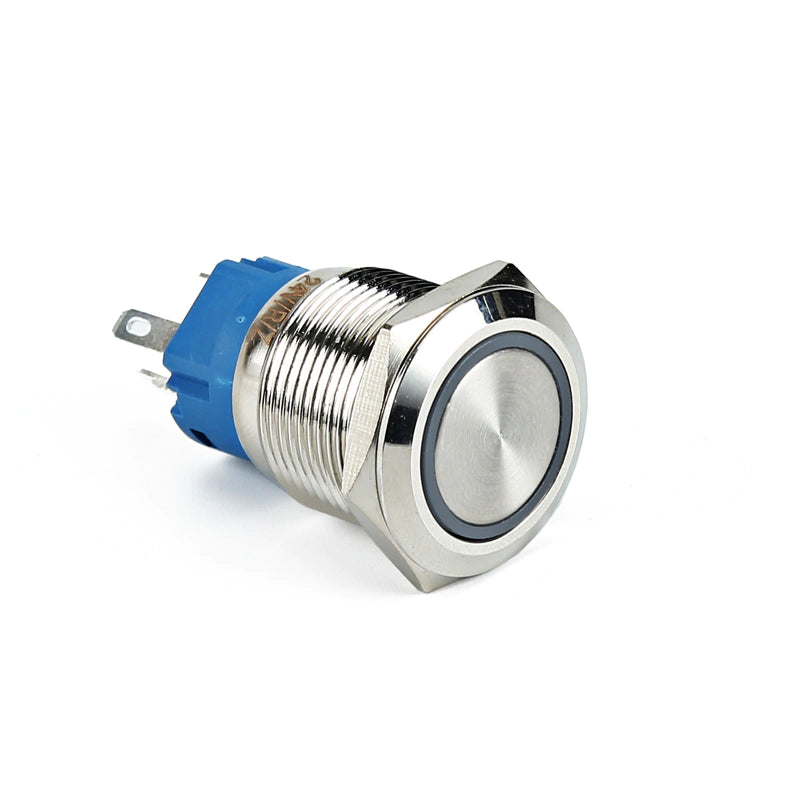 Stainless Steel Marine Push-Button Switch with Blue LED Ring, rated at 5A 12VDC.